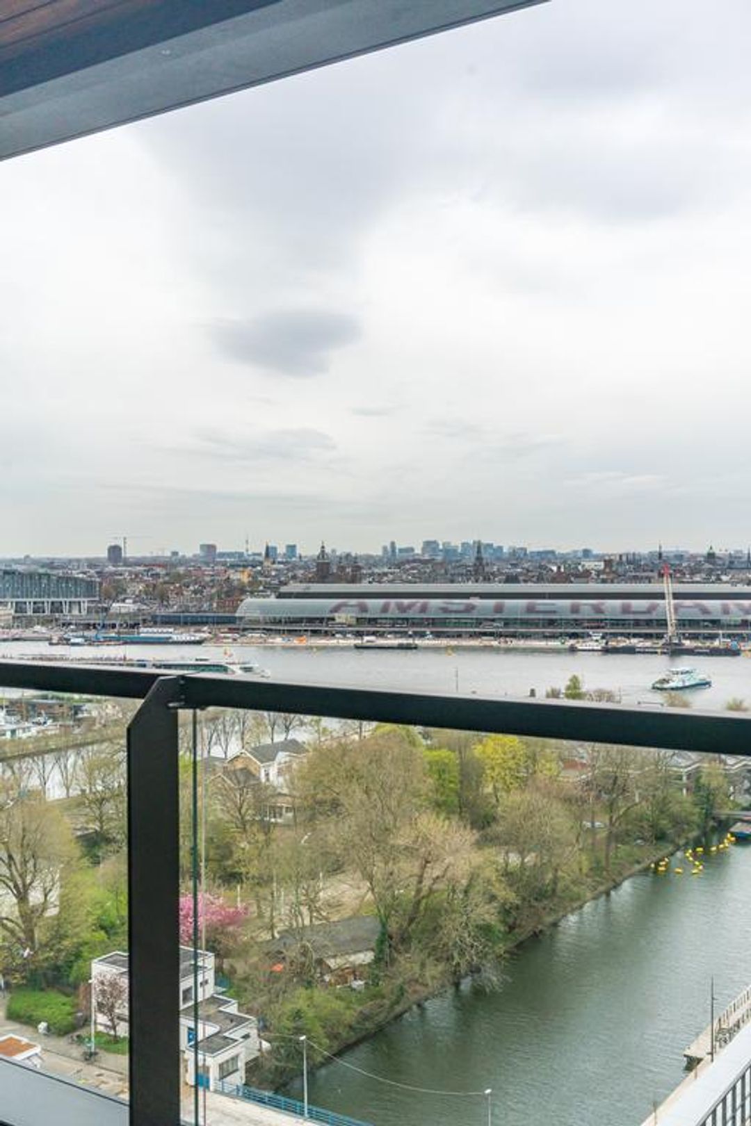 Het uitzicht over het centraal station van Amsterdam, de oude binnenstad en het water van het IJ is prachtig. Zowel van binnen als vanaf het beschutte terras van 10 m2.